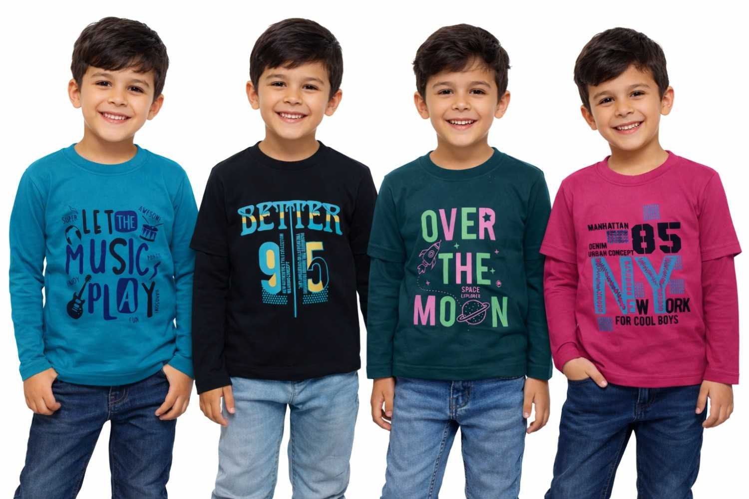 ₹310.00 – ₹350.00Price range: ₹310.00 through ₹350.00Bold and Bright Boys’ Full-Sleeve Multi-Color Printed Cotton T-Shirts with Pack of 4