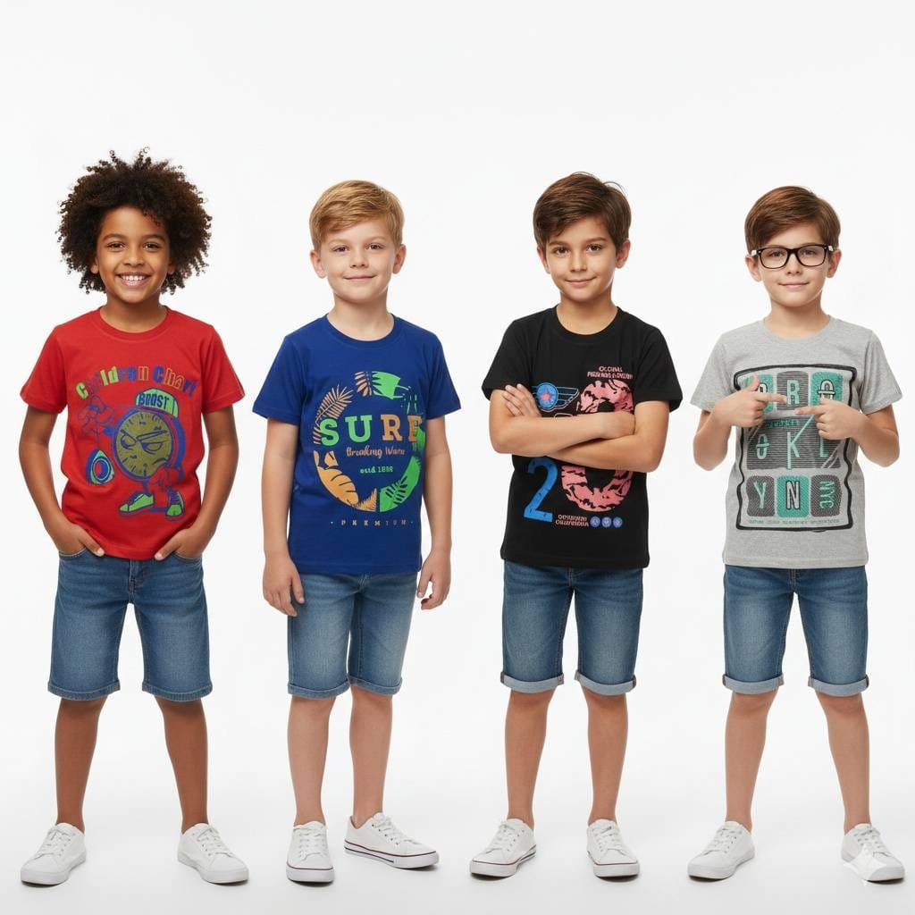 ₹110.00 – ₹210.00Price range: ₹110.00 through ₹210.00Boys’ Trendy Half-Sleeve Cotton T-Shirts with Colorful Prints with Pack of 4